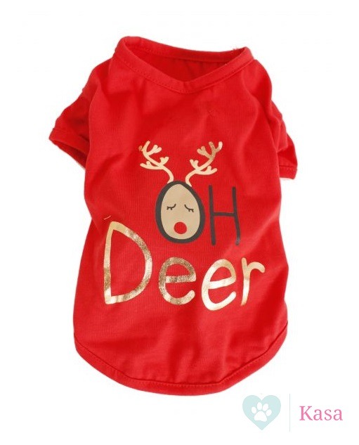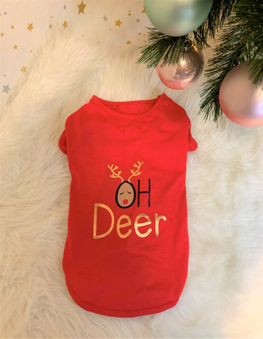 Het Croci T-Shirt Oh Deer Rood is een kerstshirt met korte mouwen in comfortabele stof met de opdruk 'Oh Deer' in zwart en goud, perfect voor de feestdagen! Het t-shirt is gemaakt van een comfortabele, niet te dikke stof zodat het ook prettig te dragen is voor honden met een dikkere vacht. Het t-shirt heeft op de rug een opdruk 'Oh Deer' met in de 'o' het gezicht van een rendier in zwart met goud. Helemaal in kerstsfeer! Eenvoudig aan te trekken en verkrijgbaar in diverse maten.