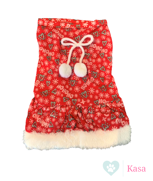 Dress Ho-Ho-Ho is een feestelijke rode kerstjurk met glitters speciaal voor de hond. De jurk is mouwloos, heeft een witte pluche rand, een strik met witte pompoms en een glitter opdruk met hartjes en de tekst 'ho ho ho'. De jurk is gemakkelijk aan te trekken door de elastische band aan de achterzijde. Geschikt voor kleine honden.
