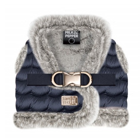 Milk & Pepper Hondentuig Lea Marine is een extra warm gevoerd donsjack wintertuigje in navy blauw gewatteerd nylon speciaal gemaakt voor de kleine tot middelgrote hond. Het Lea harnas bevat een dikke, zachte voering van grijs kleurig imitatiebont. Het tuigje sluit middels brede klittenband op de rug en bevat daarnaast een sterke goudkleurige metalen kliksluiting en dubbele D-ring voor het bevestigen van een looplijn.